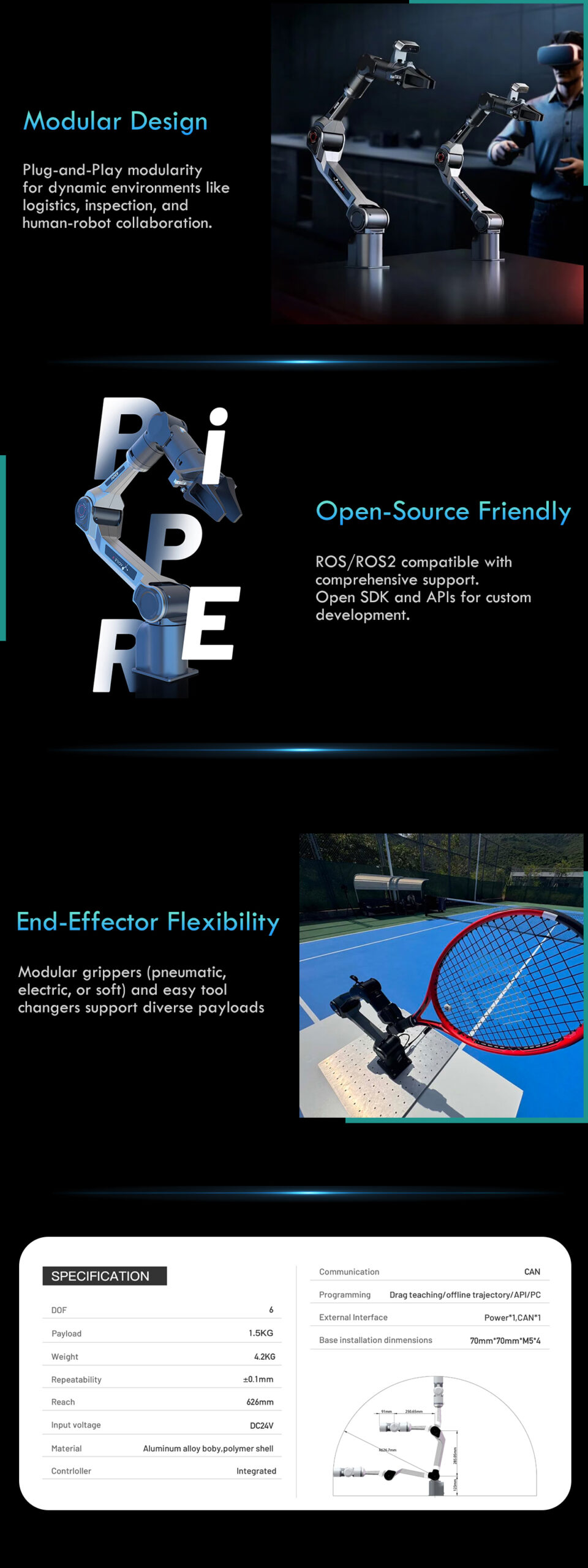 Unlike expensive industrial cobots from Universal Robots or Franka Emika, PiPER offers native ROS/ROS2 compatibility, open-source development tools, and seamless integration with mobile robotic platforms – all at a fraction of the cost. With payload options 1.5kg and a 6-DOF design providing human-like dexterity, PiPER enables breakthrough research in AI, machine learning, and autonomous systems without breaking your budget.