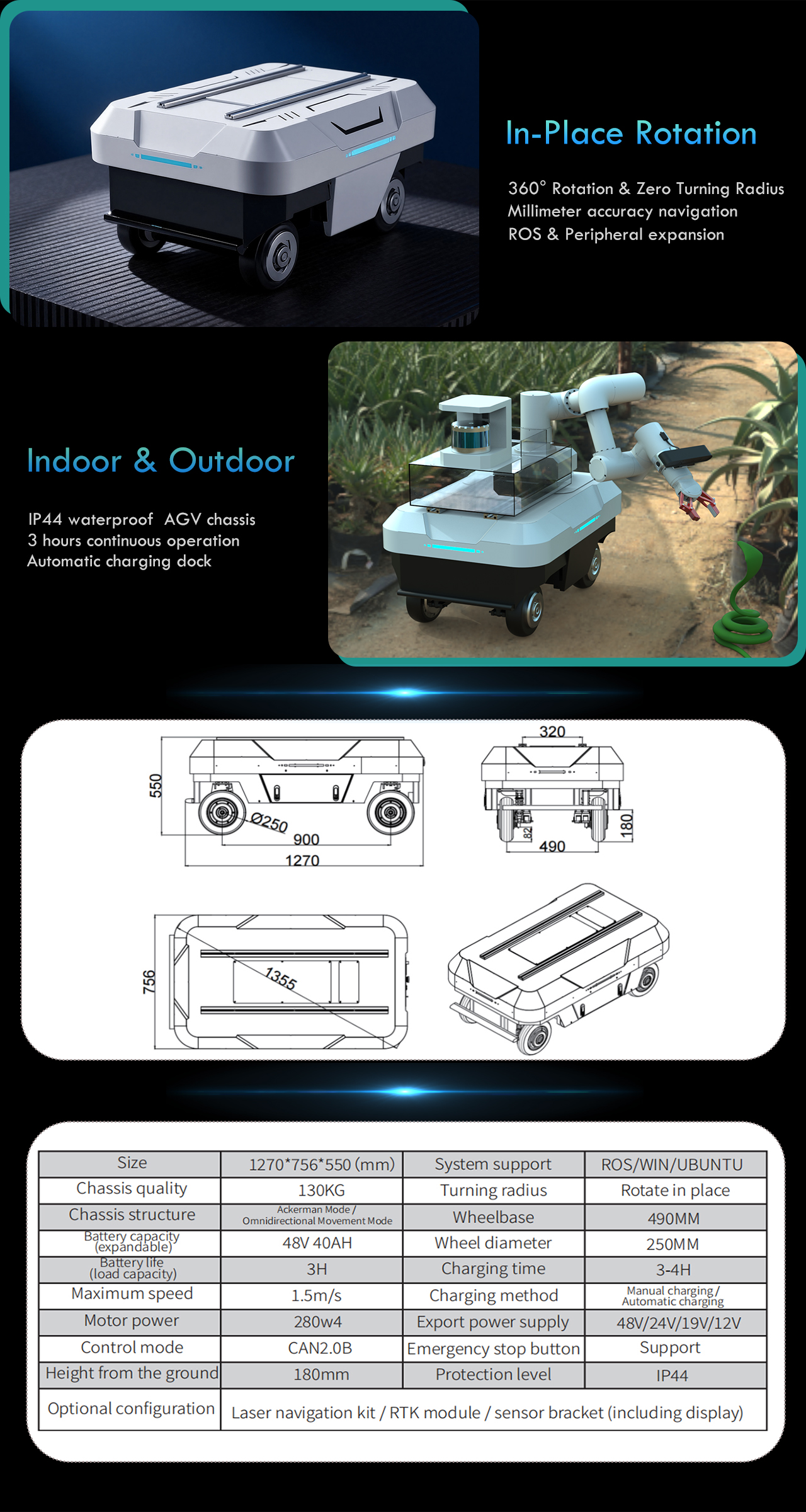 130kg payload capacity, 8 servo motors (4 driving + 4 steering), IP44 weatherproof rating, 3-hour battery life, automatic charging compatibility. VCU control system optimized for agricultural robot applications including autonomous tractors, crop monitoring drones, and harvesting robots.