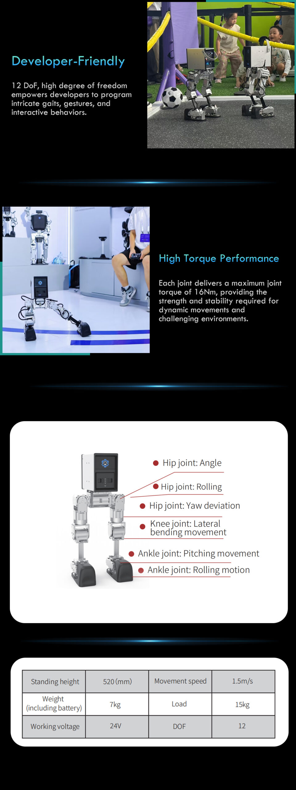 Each joint delivers a maximum joint torque of 16Nm, providing the strength and stability required for dynamic movements and challenging environments.